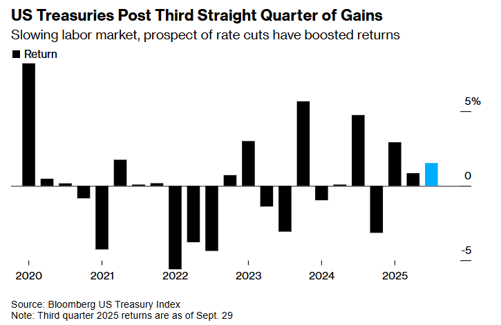Bloomberg数据显示,周二美国国债收益率普遍下降,截至目前,美国国债在本季度已实现1.5%的回报率。2025年前三个季度,美国国债的回报率超过5%,有望创下2020年以来的最佳表现。