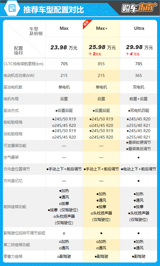 推荐车型为Max+,官方指导价25.98万元。相较入门车型Max,其最大亮点莫过于CLTC纯电续航里程由705km提升至855km,能够有效缓解用户的里程焦虑。此外,推荐车型还标配前排座椅按摩功能以及副驾驶零重力座椅,乘坐舒适性表现更好。