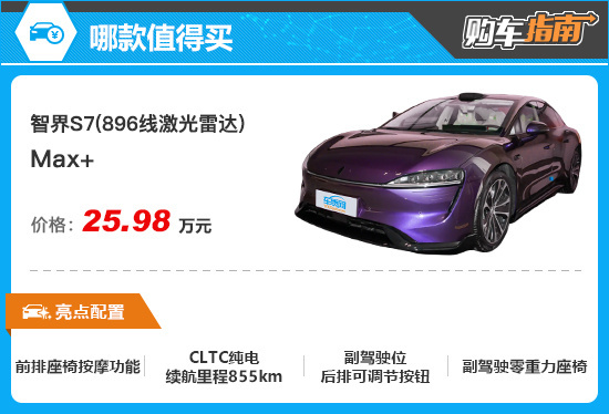 智界S7(896线激光雷达)入门车型为Max,实用性以及科技配置均较为丰富,能够满足日常用车需求。之所以不推荐,主要还是因为其CLTC纯电续航里程不够亮眼,且部分舒适性配置也有缺失,稍显遗憾。